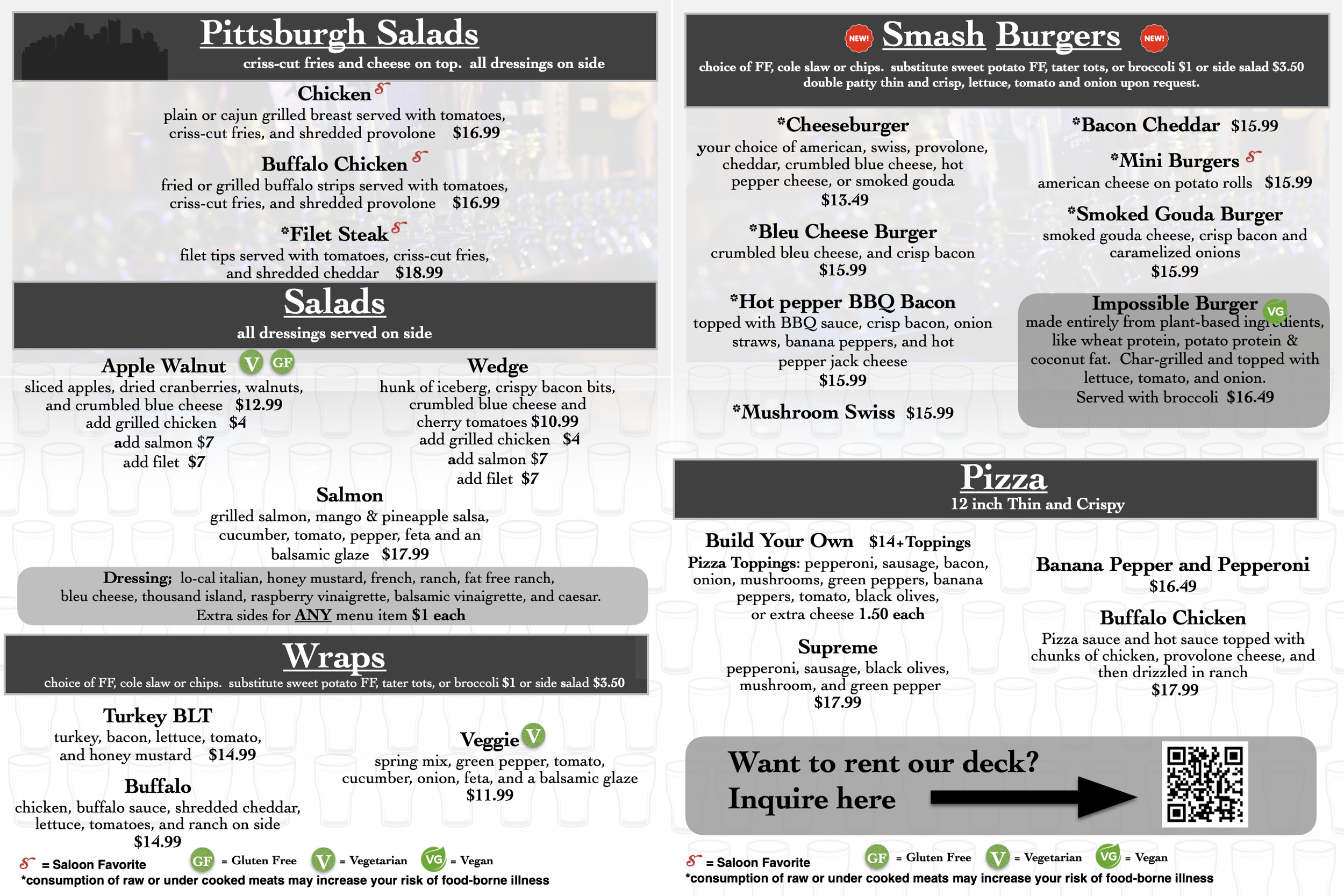 With a relaxed and casual atmosphere, The Saloon of Mt. Lebanon has been quenching thirsts for more than 38 years. Our beer selections can be mind boggling, we have expanded our draft beers to 30 and over 50 bottled beers. Of course, we also have a fully stocked bar with liquor and wine. As for food, our menu consists of a wide variety of appetizers, sandwiches, wraps and salads. Favorites include our buffalo-style chicken wings and burgers. We have our own special recipe sauce for the wings. Once you try our wings you won’t want any others.