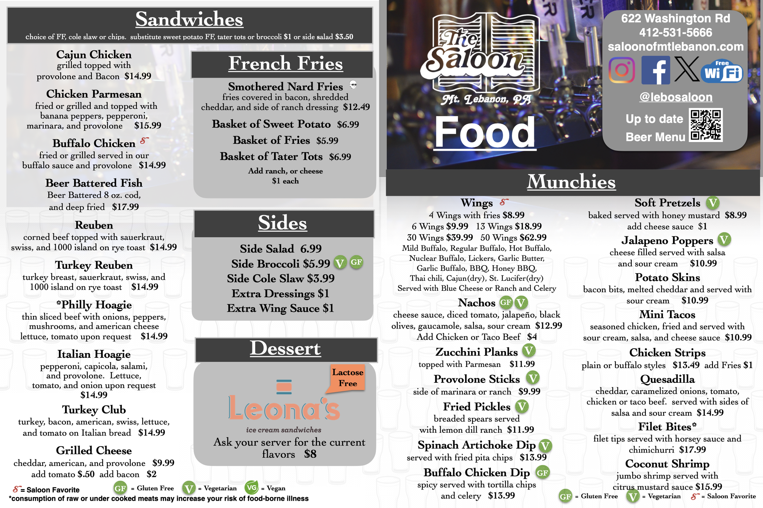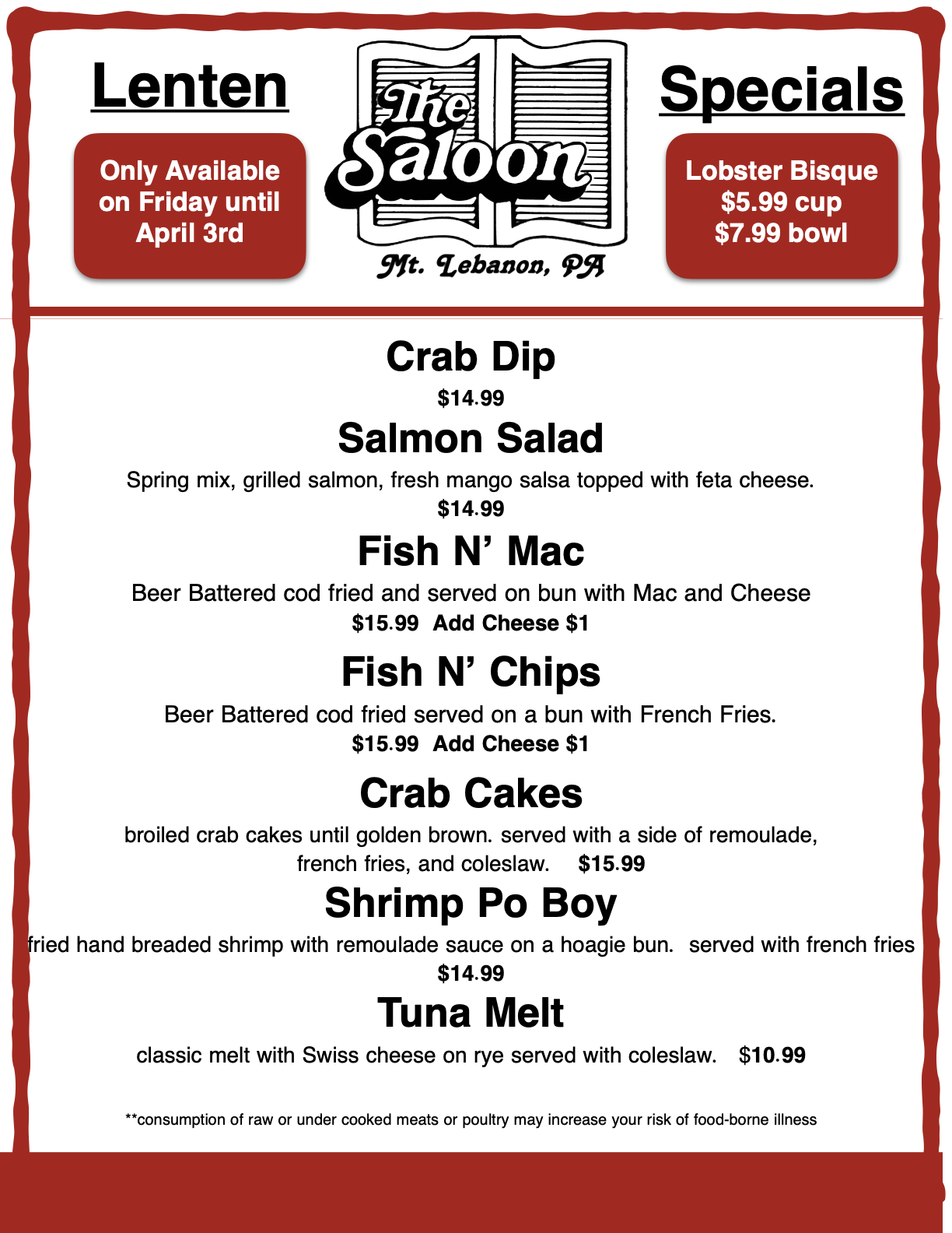 The Saloon of Mt. Lebanon opened its doors on November 1st, 1976 Similar to Cheers, the Saloon quickly grew a reputation for being the place in the South Hills where everybody knows your name. The Saloon has attracted many of the same patrons over the years, while at the same time inviting a new generation who are eager to pull up a bar stool as well. We pride ourselves in maintaining an atmosphere that our loyal customers have come to expect, and our new customers will be excited about.
